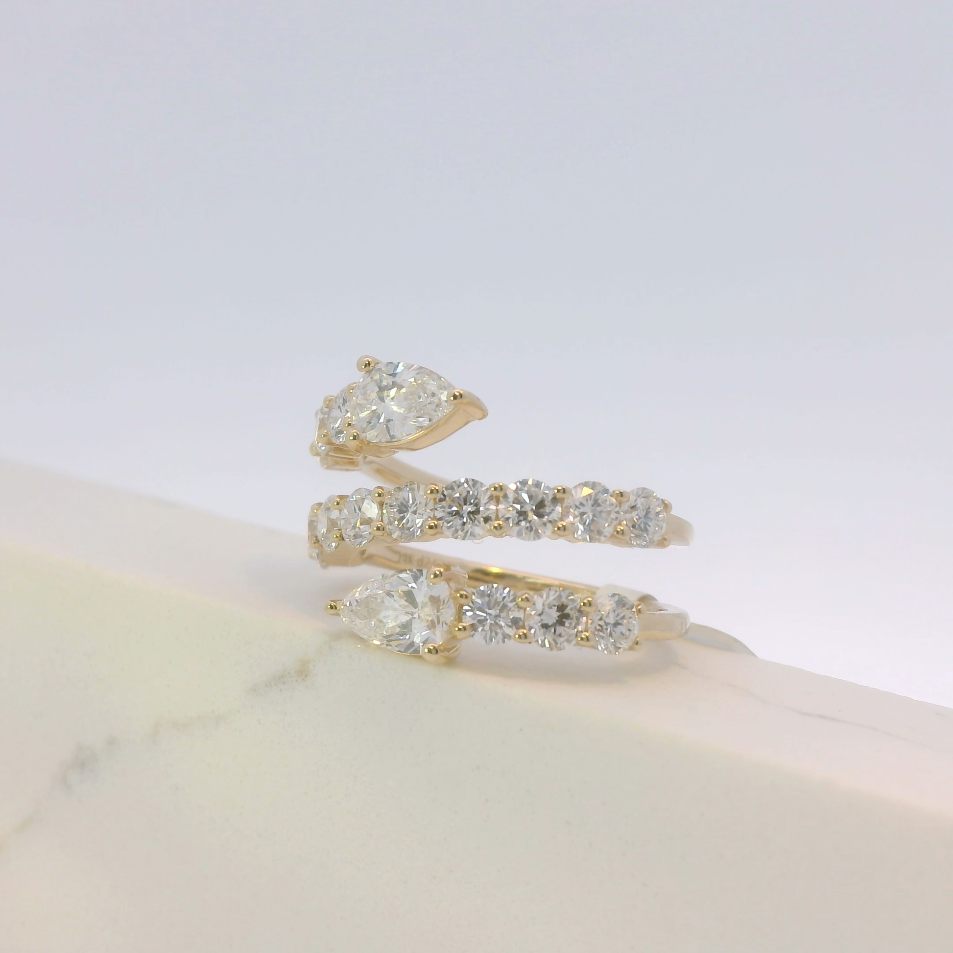 There’s a quiet power in her restraint. She moves with a stillness that speaks louder than noise, and when she looks at you, really looks - it’s with the weight of a woman who sees beyond surface. The Avara ring wraps around the finger in a fluid spiral, like a whispered promise or a well-kept secret. It’s not loud. It doesn’t ask to be noticed. But it holds your gaze, anchored by twin pear-cut Diamonds (LG) that mirror each other in perfect, deliberate symmetry.